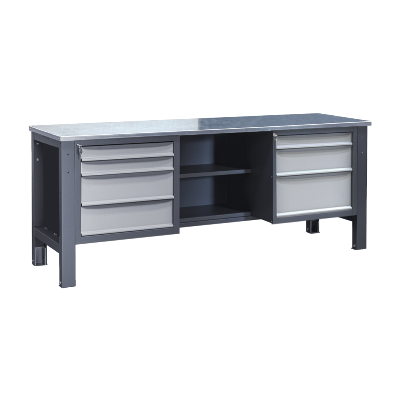 Augstas kravnesības tērauda darba galds darbnīcai ar 2 mm cinkota tērauda virsmu, 7 atvilktnēm un 2 plauktiem instrumentu un piederumu uzglabāšanai.